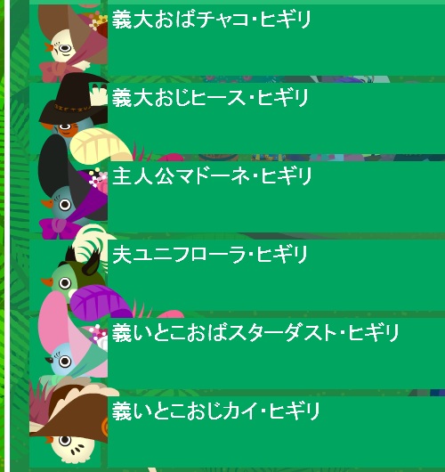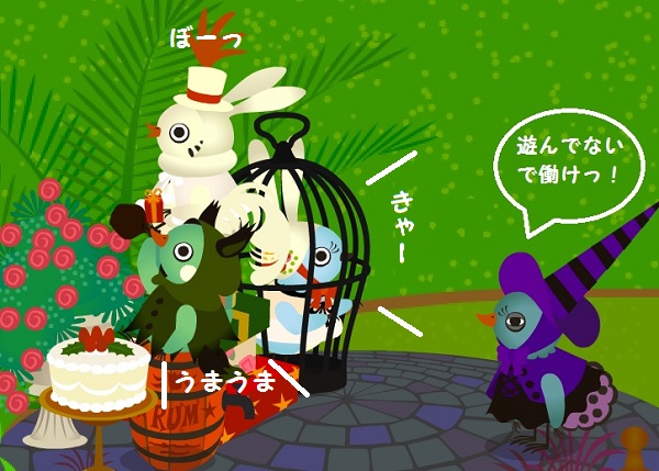 更新かけてみたりキャッシュ削除してみたりしましたが、インした後、トリのさえずりが聞こえるのみで画面真っ暗です…… 家族一覧もフレンドも空っぽです。 ずっとこのままなのかな…フレンドさん達は大丈夫だったのかな?普通にイン出来てる??もし、私だけ落ちてたら何も言わずに落ちちゃってごめんなさいです。 このまま入れなかったら運営に聞いてみようと思います。カイとスーちゃんのタマゴの孵化までには入れるようになってればいいな… うちのトリは今マップ外にいるそうです。 ハウス消えてないよね?ちょっと心配です。 イン出来ないので皆にはホルホルのタップダンスを見てもらって気持ちを落ち着けてもらおう。 クサカさん、ごめん。思わずアップしちゃいました。 もし都合悪かったら消すので連絡お願いします。 2011.11.02 Wed 21:50:10 ゴージャス!我が家の若者はこんな感じの毎日です。 ウサギ捕獲だ!わはははは!! といった感じで遊んでました。トリがついて来る状態で家具持つとこうやってハウス外でもアクション出来て面白いです。 セレブも捕獲! カイが着ている服を買ったら服が没収されました。 ちゃんと戻ったので、他の服も購入です。 お嫁さん達にも着てもらってます。黒い帽子は他の服にも合わせやすいのでドレスは買ってませんが、ピンクとベージュは上下セットで買っちゃいました。 派手な一家にりました。 来週のも気になります。課金あんまりしないつもりだったのに…巣箱のツボすぎて来週までにはナッツを追加してしまう予感。というか、コンビニ行く気まんまんです。 いいもん、お嫁さん達可愛いからいいもん。生まれてくる子にも着せるんだ! 2011.11.01 Tue 22:50:02 お祝いとお別れお嫁に来てくれたスーちゃんがママになります!